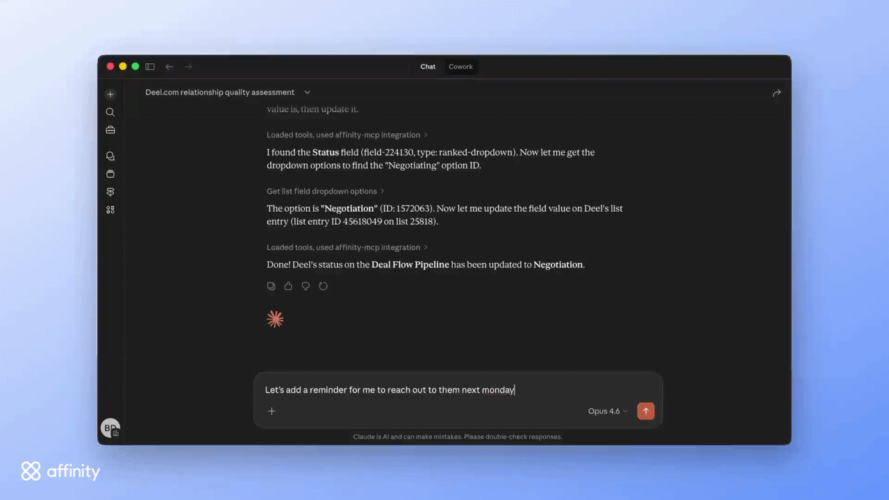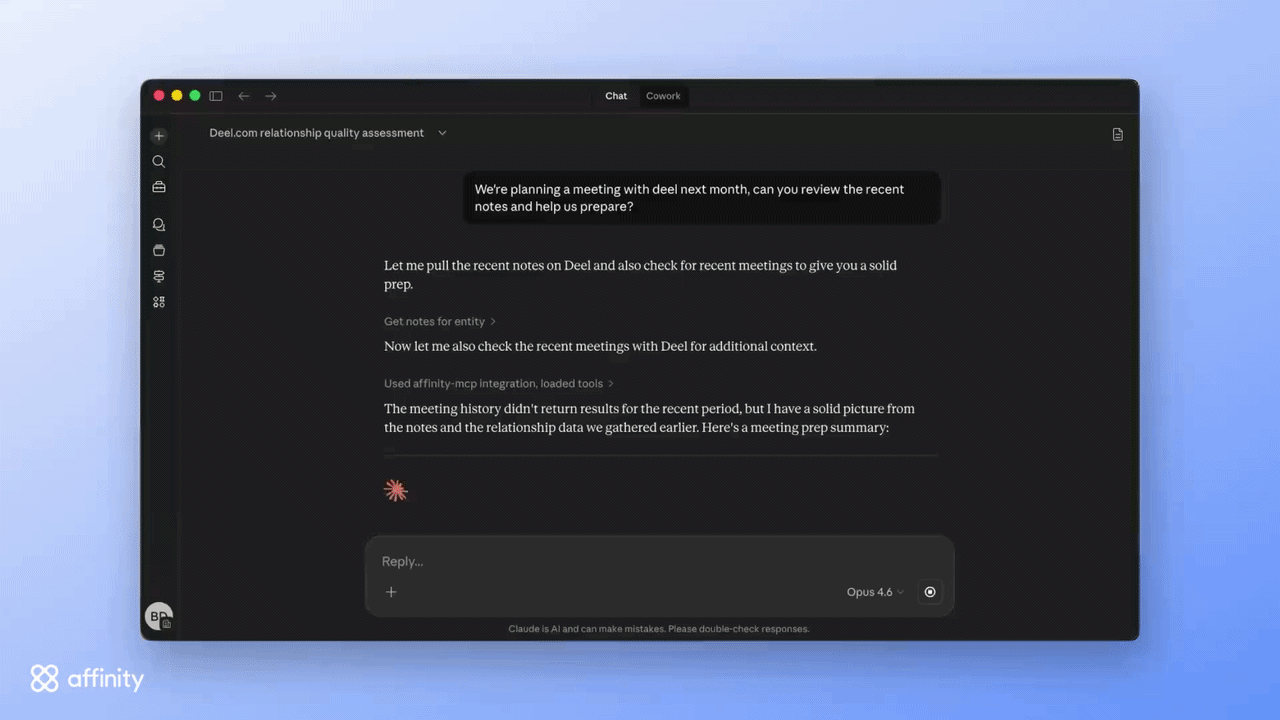 Affinity MCP opens it up. Now your AI tools can start pulling from your live relationship graph, deal data, and interaction history the same day.