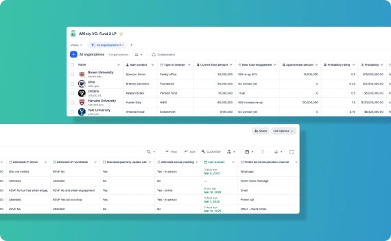 Organization lists can be used to track LP status, relationship management, and financial data—helping your team streamline the fundraising process.
