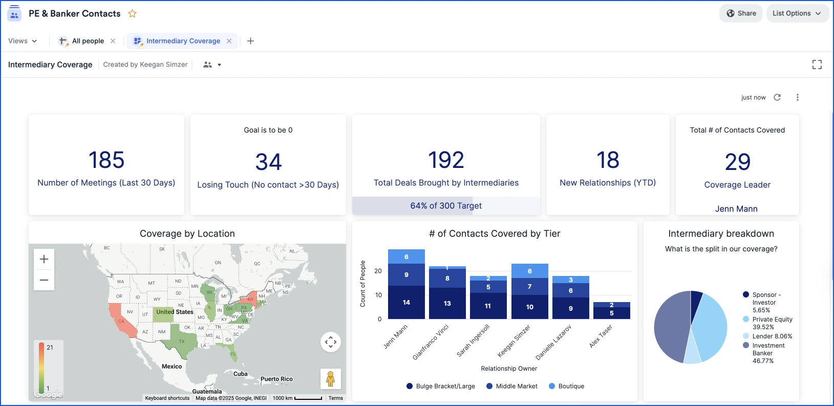 - Provide leadership visibility into relationship coverage across management teams, intermediaries, and co-investors